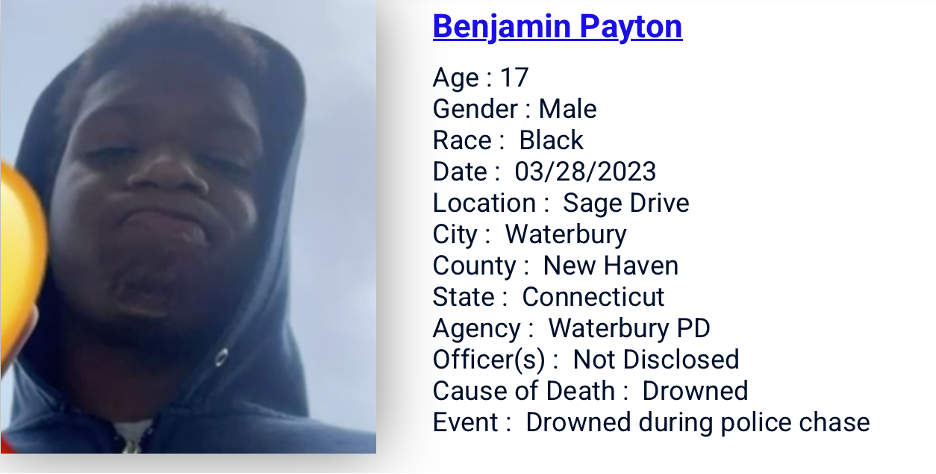 28 Mar3/28/2023: Benjamin Peytondrowned and died when police chased him into a body of water. More in link. Post Views: 244BuyMeCoffeeSupport us to continue building the database and maintain the site. Share now Twitter Facebook WhatsApp LinkedIn Print 0Shares