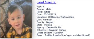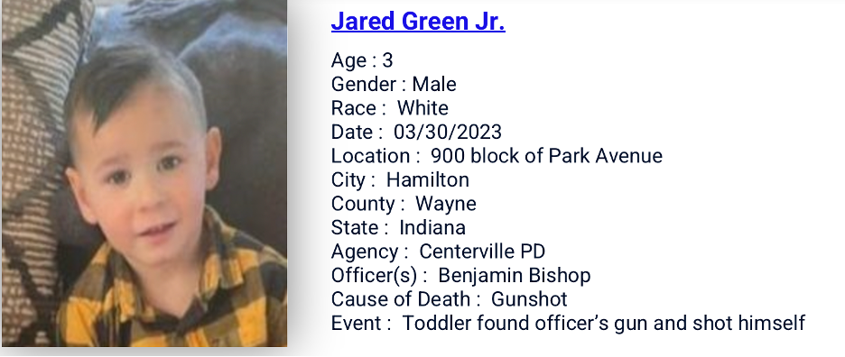 30 Mar3/30/2023: Jared Green, 3, shot and killed himselfwith the service gun and officer left unsecured at his residence. More in link. Post Views: 241BuyMeCoffeeSupport us to continue building the database and maintain the site. Share now Twitter Facebook WhatsApp LinkedIn Print 0Shares